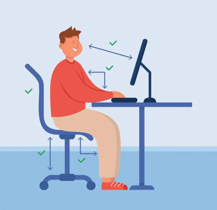 1. 椅子的选择:理想的座椅高度应使你的膝弯略高于臀部,大腿与地面大致平行。椅面不宜过深,以免压迫膝后。