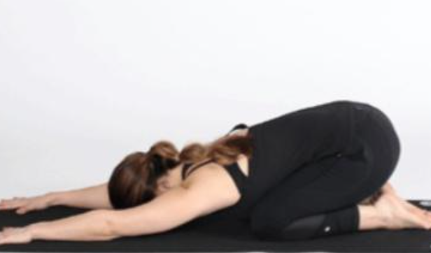 双手和膝盖放在地上,臀部向后下沉,让它们靠在脚后跟上。当你向前折叠时,铰链在你的臀部,双手在你面前伸出。将腹部放在大腿上,手臂伸到身体前方或身体旁边,手掌朝上。专注于深呼吸并放松任何紧张或紧绷的区域。保持这个姿势最多1分钟。动作步骤: